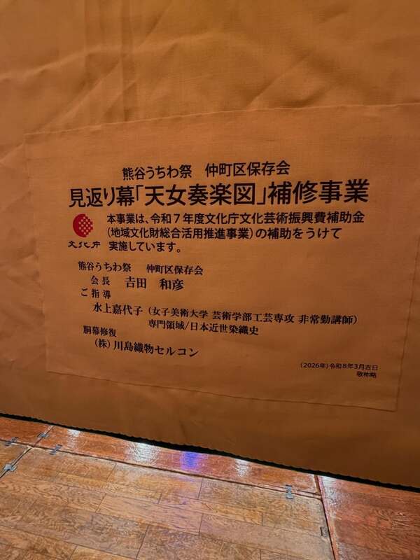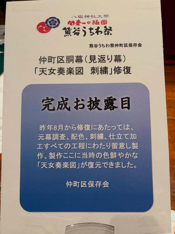 12日は、私が所属している仲町区 @nakacho_nakamutsumikai の主催で、八木橋百貨店さんのカトレアホールにて、お囃子体験会と大規模修繕を行った見返り幕の御披露目を行いました。小林たくろうとしては、仲町区総代として、イベントの司会進行役を務めさせていただきました。小さい町の仲町区としては、町外の方々からの協力がなければ、熊谷うちわ祭を続けていくことは出来ません。熊谷うちわ祭と仲町区を、町外・市外の方々に少しでも多く知っていただき、熊谷うちわ祭に参加していただける方を増やしていくことを、今後も続けていきたいと思っております。また、イベントでは明るい照明の下で、仲町区の見返り幕「天女奏楽図」をまじまじと眺められたのですが、手前味噌ながらあらためて仲町区の見返り幕はとても美しいなと感じる機会になりました。お祭り当日には、是非リニューアルした仲町区の見返り幕にご注目いただければと思います!