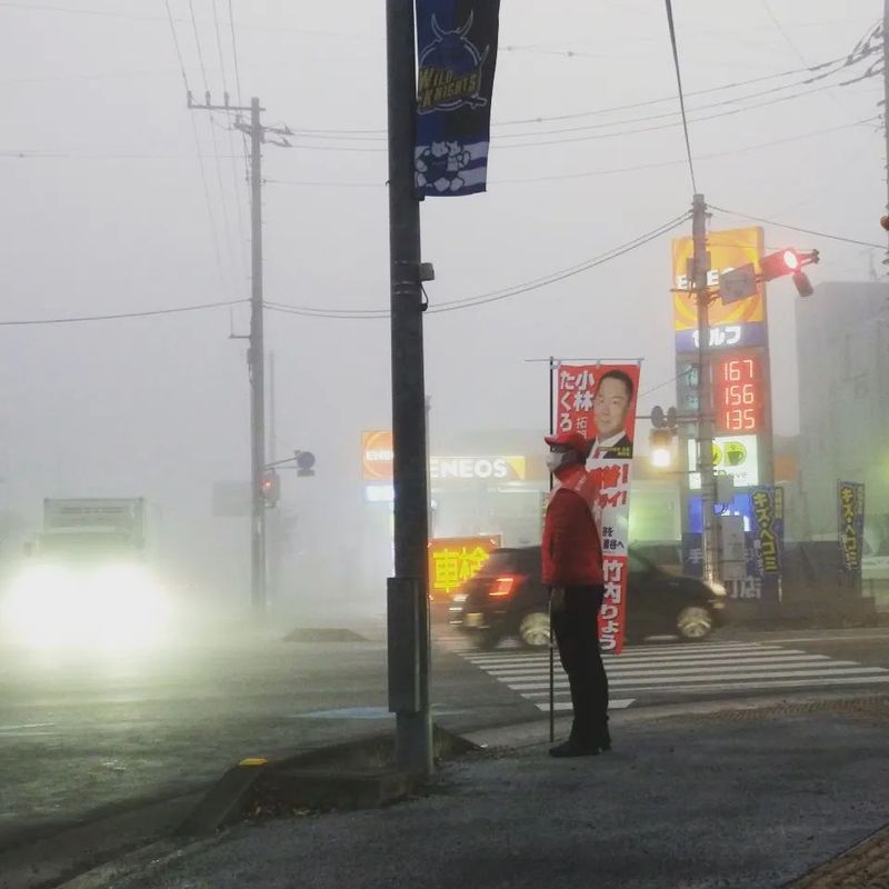 ホーム>政党・政治家>小林 たくろう (コバヤシ タクロウ)>今朝は地元の中央交差点でご挨拶とお見送りをしましたが、8時半くらいまで凄い霧でした車の方も自転...