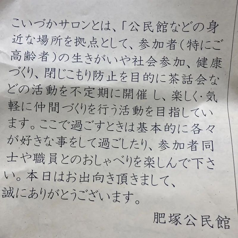 今日は、地元の肥塚公民館で開催された、「こいづかサロン」にお邪魔しました。