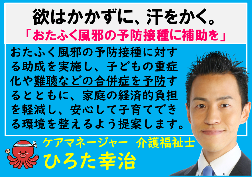 ホーム>政党・政治家>ひろた 幸治 (ヒロタ コウジ)>おたふく風邪の予防接種に補助を