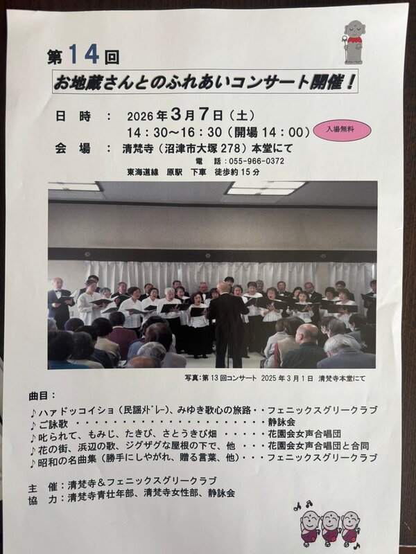 沼津市大塚にある"清梵寺"で開催されました。住職の肥田英臣さんが、専修大学でグリークラブに所属してたことが縁で、年間1回開催され14回目になります。