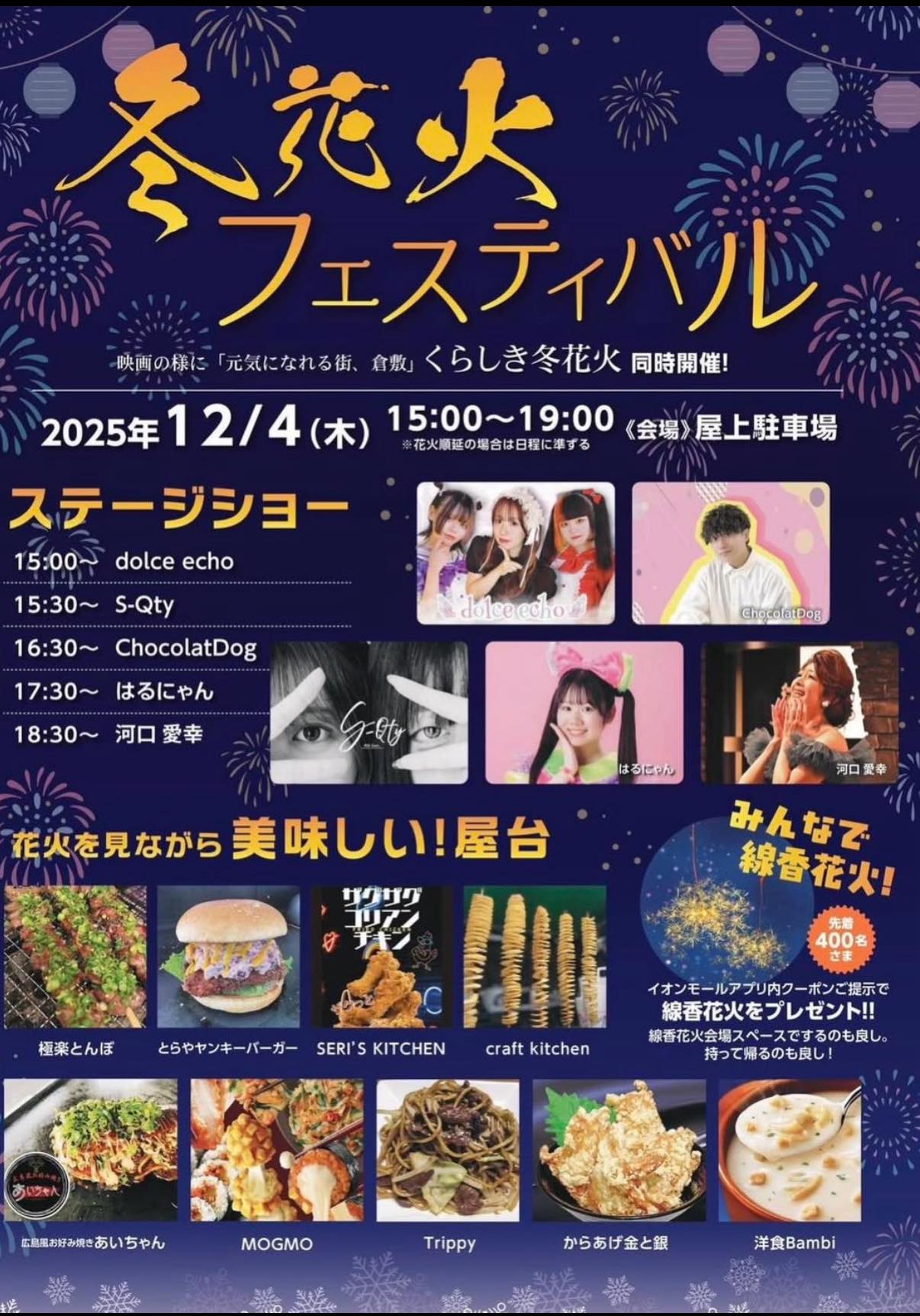 12月4日(木)18時から15分程度、約500発の花火が打ち上げられ、イオンモール倉敷の屋上駐車場で観覧できます。