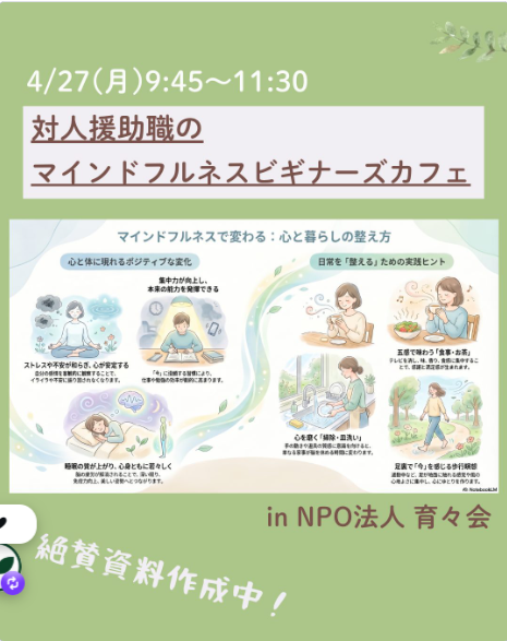 ⑦4月27日(月)9時45分~11時30分にアトリエ・トノーブで対人援助職のマインドフルネスビギナーズカフェが開催(参加費500円 要申込)