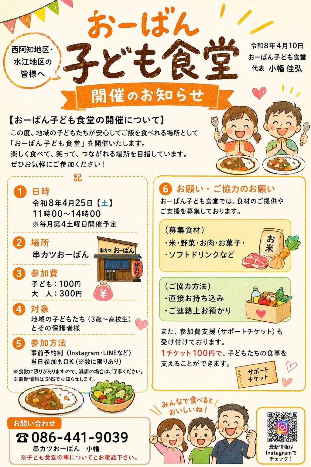 ⑨4月25日(土)11時~14時に串カツおーばん(倉敷市西阿知町11-2)でおーばん子ども食堂が初開催