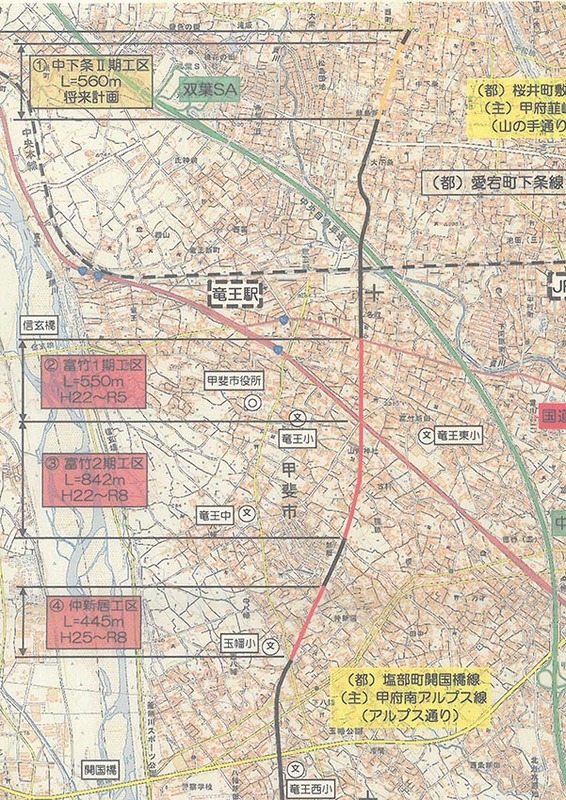 甲斐市の旧敷島町から中央市の旧田富町まで山梨県が整備している「田富町敷島線」は、今から54年前、半世紀以上前に都市計画決定された路線ですが、いまだに全線完成がいつになるのかわからない状況です。