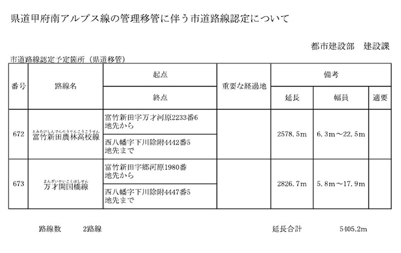 県道甲府南アルプス線、通称「廃棄道」と「バス通り」の2路線が山梨県から甲斐市へ管理移管されることになりました。当初の予定では今年度当初に行う予定でしたが、個人名義の土地の解消に時間がかかり半年ほど遅れたものであります。