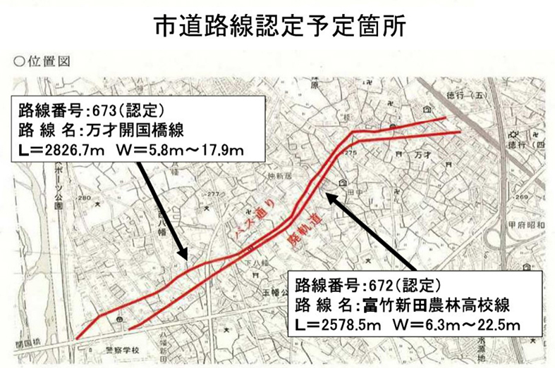 現在の県道としての名称は2路線合わせて「県道甲府南アルプス線」となっていますが、移管後の市道としての正式名称は南側の廃軌道を「富竹新田農林高校線」、北側のバス通りを「万才開国橋線」となります。