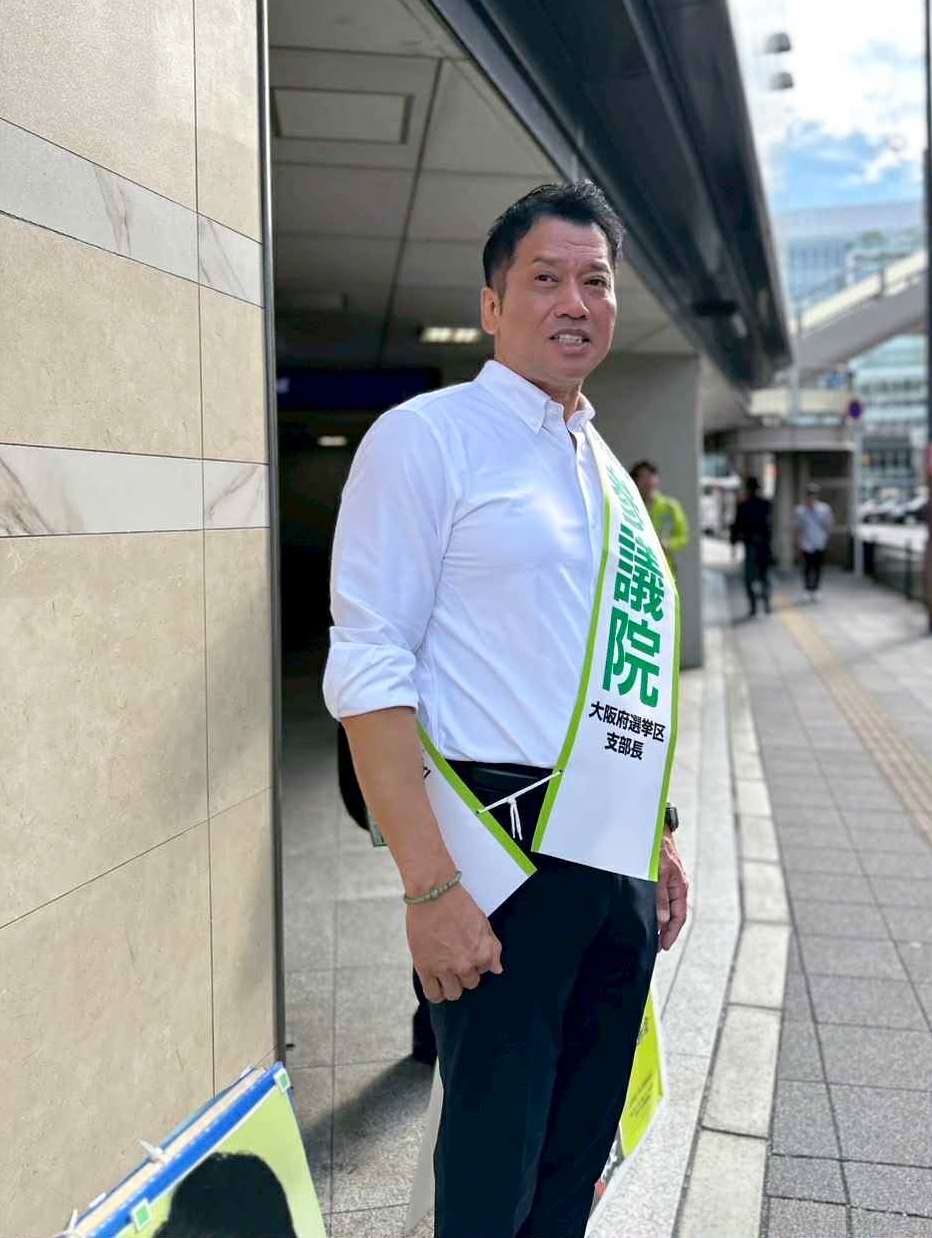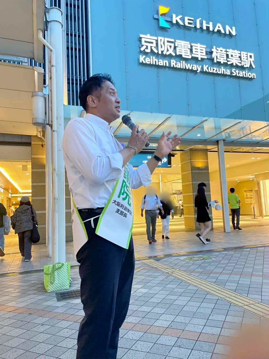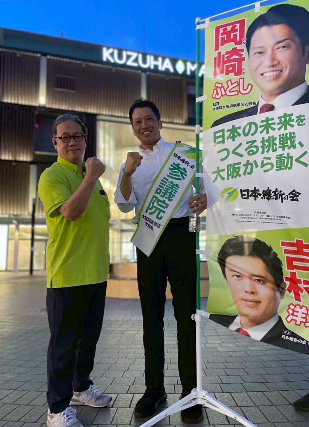 日本維新の会参議院大阪府選挙区支部長に就任された岡崎ふとしさんとともに、枚方市内にて活動を行っています。