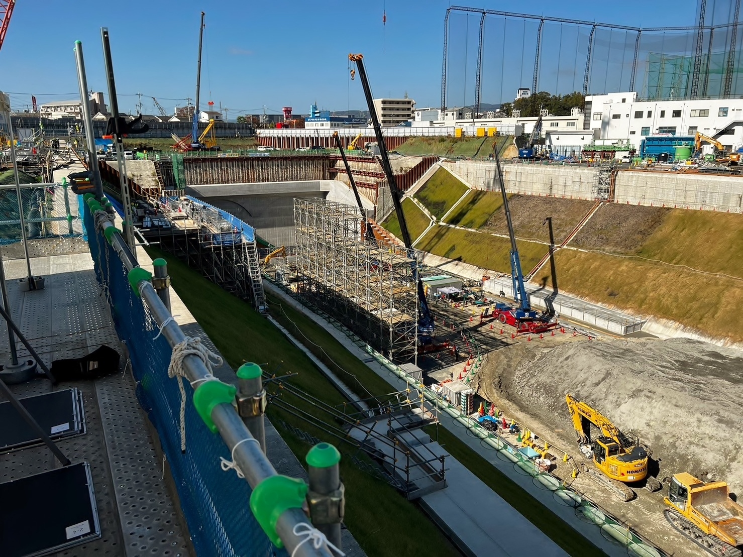 枚方トンネルでは、掘削に必要な設備の整備や機械の組み立てなど、安全に工事を始めるための下準備が続いている状況です。