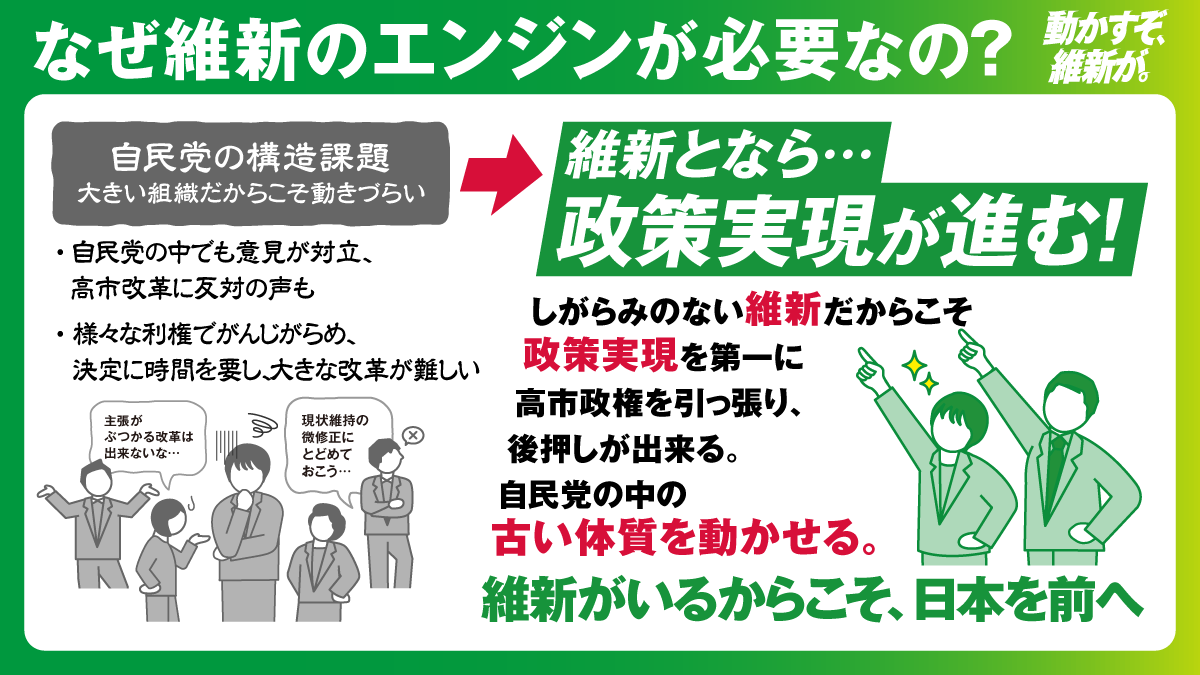 日本維新の会と自民党との連立合意を、着実に実行していくことが重要になります。