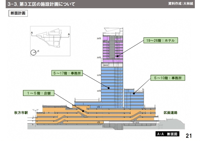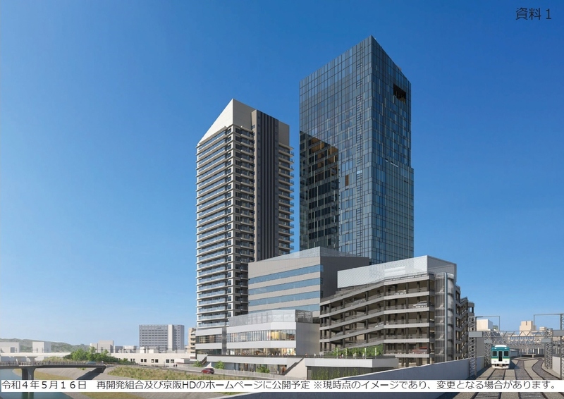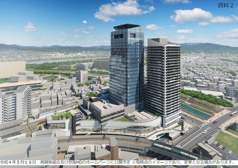 主にオフィスやホテルが入る26階建ての高層棟や、29階建ての住宅棟をはじめ、1~4階を中心に商業施設が入る予定で、京阪・枚方市駅と一体になった複合施設となります。