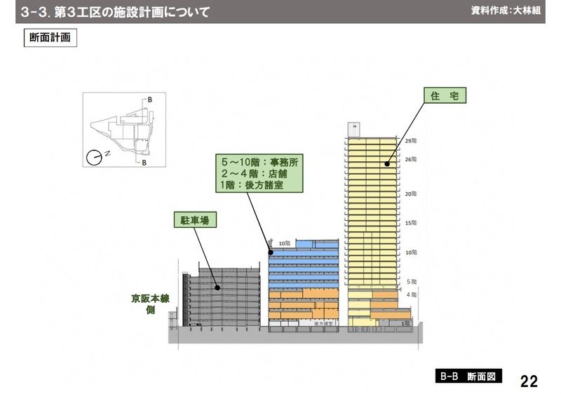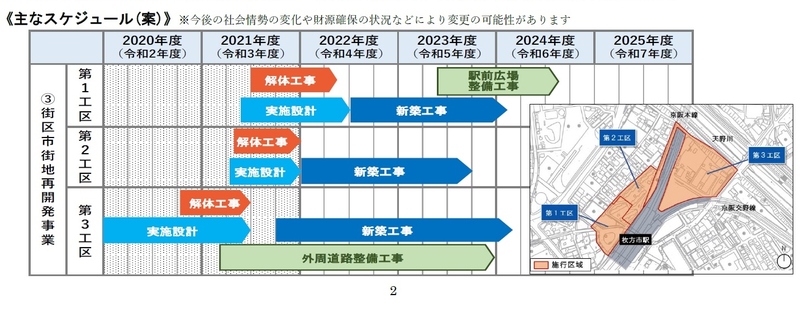 この③街区第3工区は、枚方市駅周辺地区市街地再開発組合が施行者となり、京阪本線と交野線とに挟まれたエリア、いわゆる「三角地」において、令和6年度のできる限り早い時期の完成を目指し、現在、建設工事が進められています。