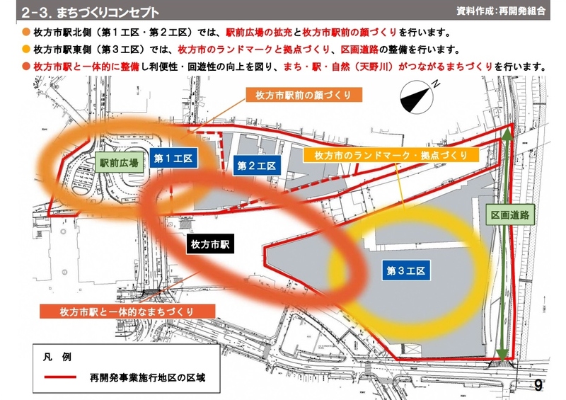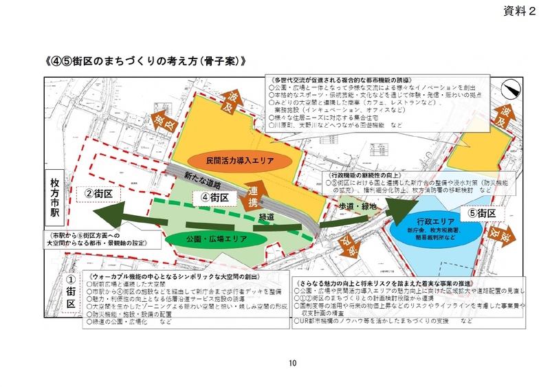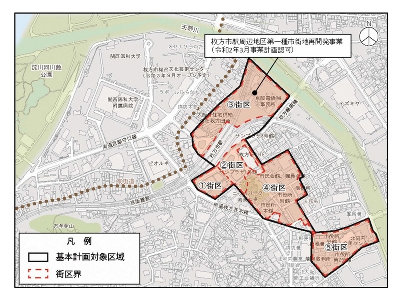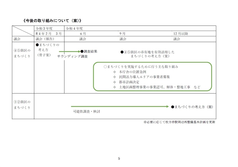 枚方市駅周辺再整備については、「③街区」において、着々と工事が進められていますが、現在の市役所のある「④街区」や、府民センターのある「⑤街区」のまちづくりについても、スピード感を持って進めていかなければなりません。