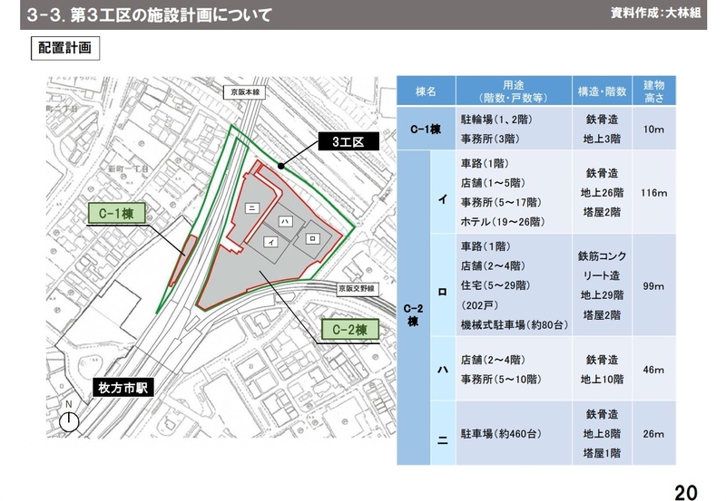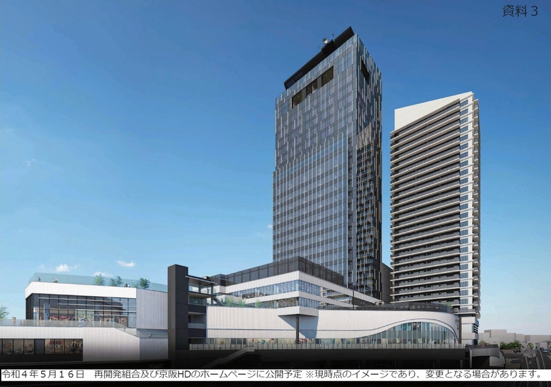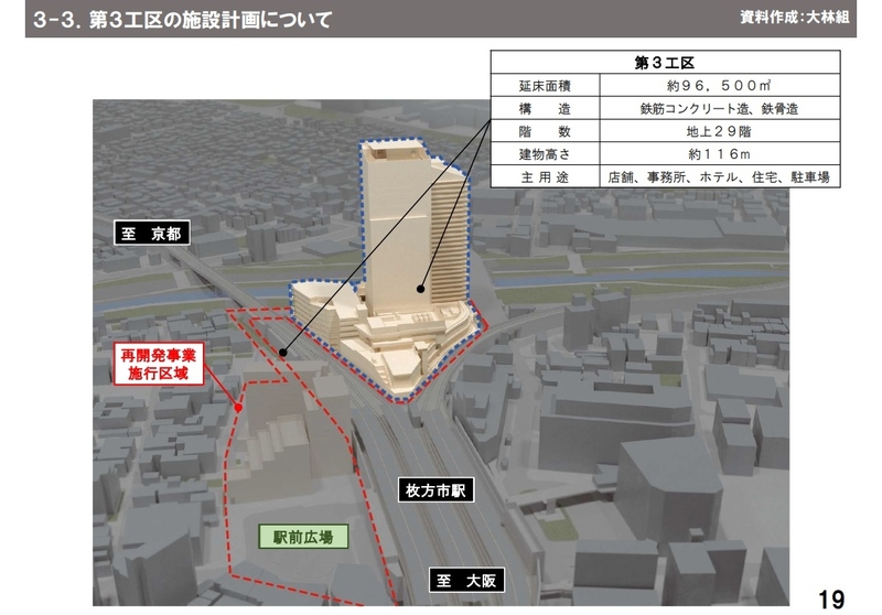 枚方市駅周辺再整備のまちづくりの一環として「③街区第3工区」で建設が進められている複合施設の工事完成後のイメージ図が公開されました。