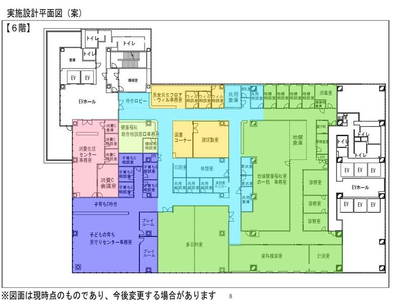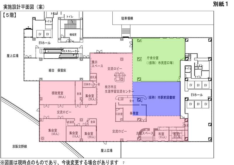 枚方市役所の窓口機能についても、市民の利便性向上のために、枚方市駅と一体のこの施設の5階、6階の2フロアに、住民票や戸籍関係の窓口をはじめ、図書館、生涯学習交流センター、消費生活センター、健康福祉総合相談窓口、子どもの育ち見守りセンター、保健センターの相談窓口や検診のスペースなどを開設する予定となっています。