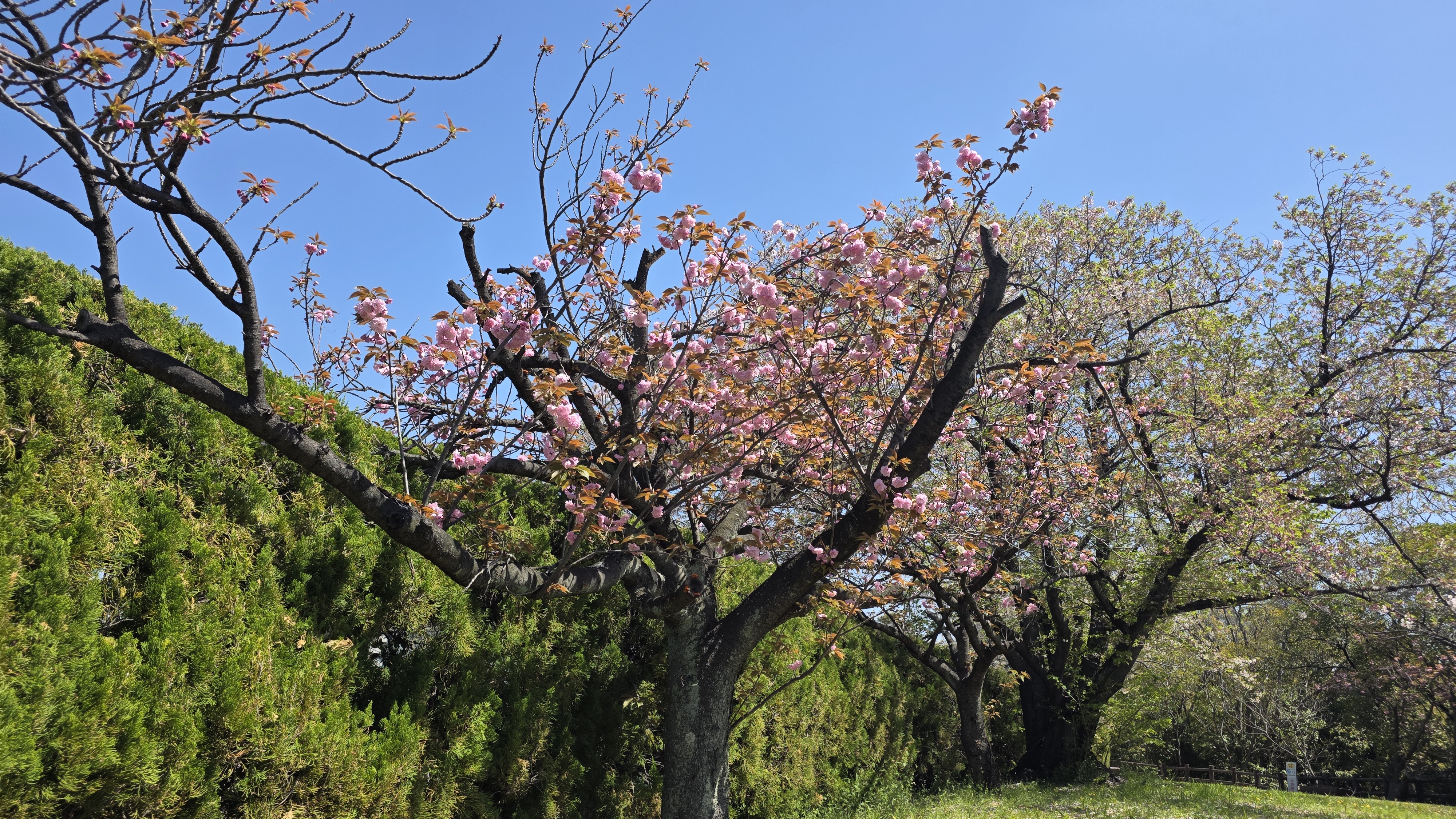 開成公園は、開成小学校の裏側にあります。階段を上った先の公園なので、目立ちませんが、ソメイヨシノ、ヤエザクラが順番に花を咲かせます。