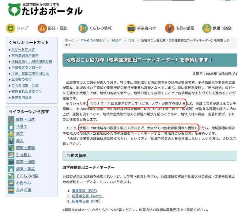 武雄市が新たに募集している「地域おこし協力隊(域学連携創出コーディネーター)」。