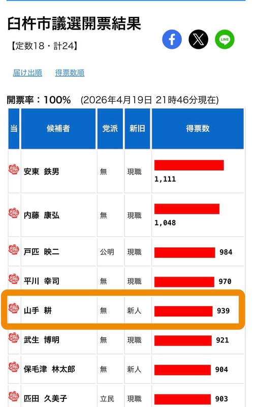 大分県・臼杵市議会議員選挙 山手耕(やまて・こう)さん 定数18に24人出馬の大激戦 新人ではトップ当選