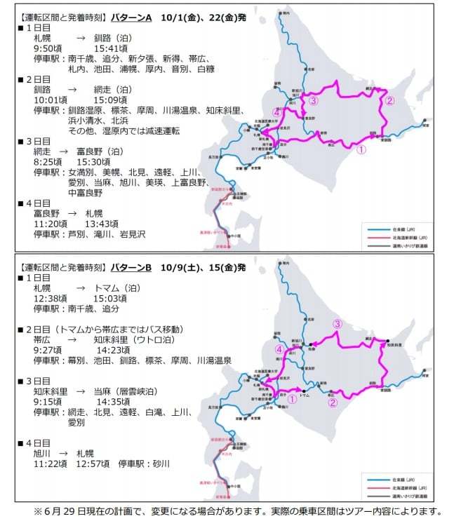 新しく観光列車用車両として製造された「ラベンダー」と「はまなす」の2編成を使用し、JR北海道、JTB、そして、日本航空が連携して、今年10月に計4回、北海道内を3泊4日で巡るツアーを計画しているとのこと。