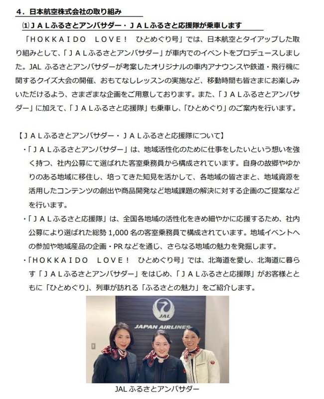 JR北海道が列車の運行を担当、日本航空からは「JALふるさとアンバサダー」「JALふるさと応援隊」が乗車し、御客様をおもてなし、そして、JTBが旅行商品を販売する、という3社連携も意欲的な試みです。