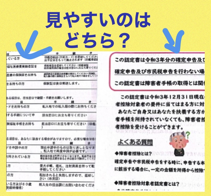 下の写真の右側の書類は、12ポイント。左側は10ポイント以下です。左側はとても字が小さく、読みにくいのです。この改善を求めました。
