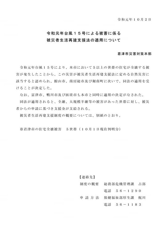 朗報☆君津市が被災者生活再建支援法の対象になりました。