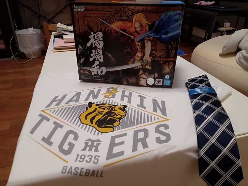 上の娘からは漫画『キングダム』の楊端和(ようたんわ)将軍のフィギュア、下の娘からは阪神タイガース公式Tシャツとネクタイ。