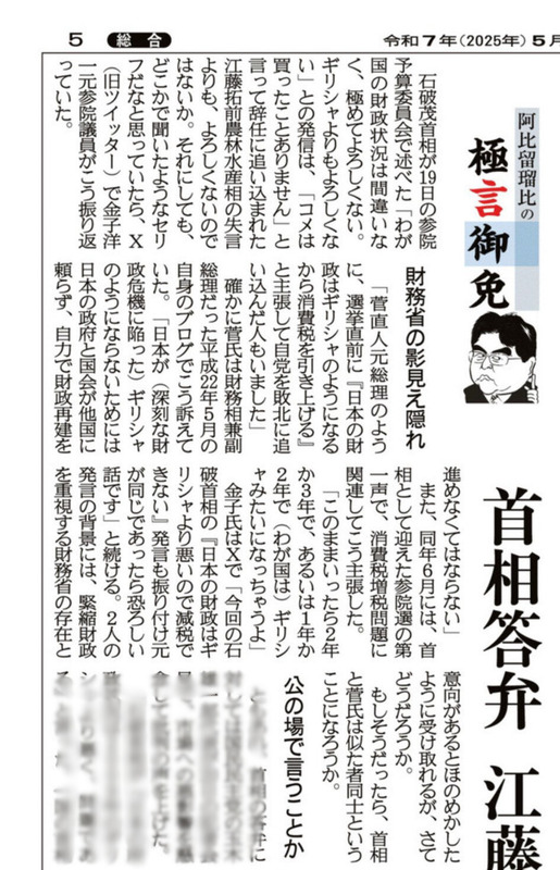 阿比留瑠比 @YzypC4F02Tq5lo0 氏による産経新聞「阿比留瑠比の極言御免」に、石破総理の「日本の財政はギリシャ以下」とする発言に関する私の先日のXポストを取り上げていただきました。記事の一部を添付します。ありがとうございました。