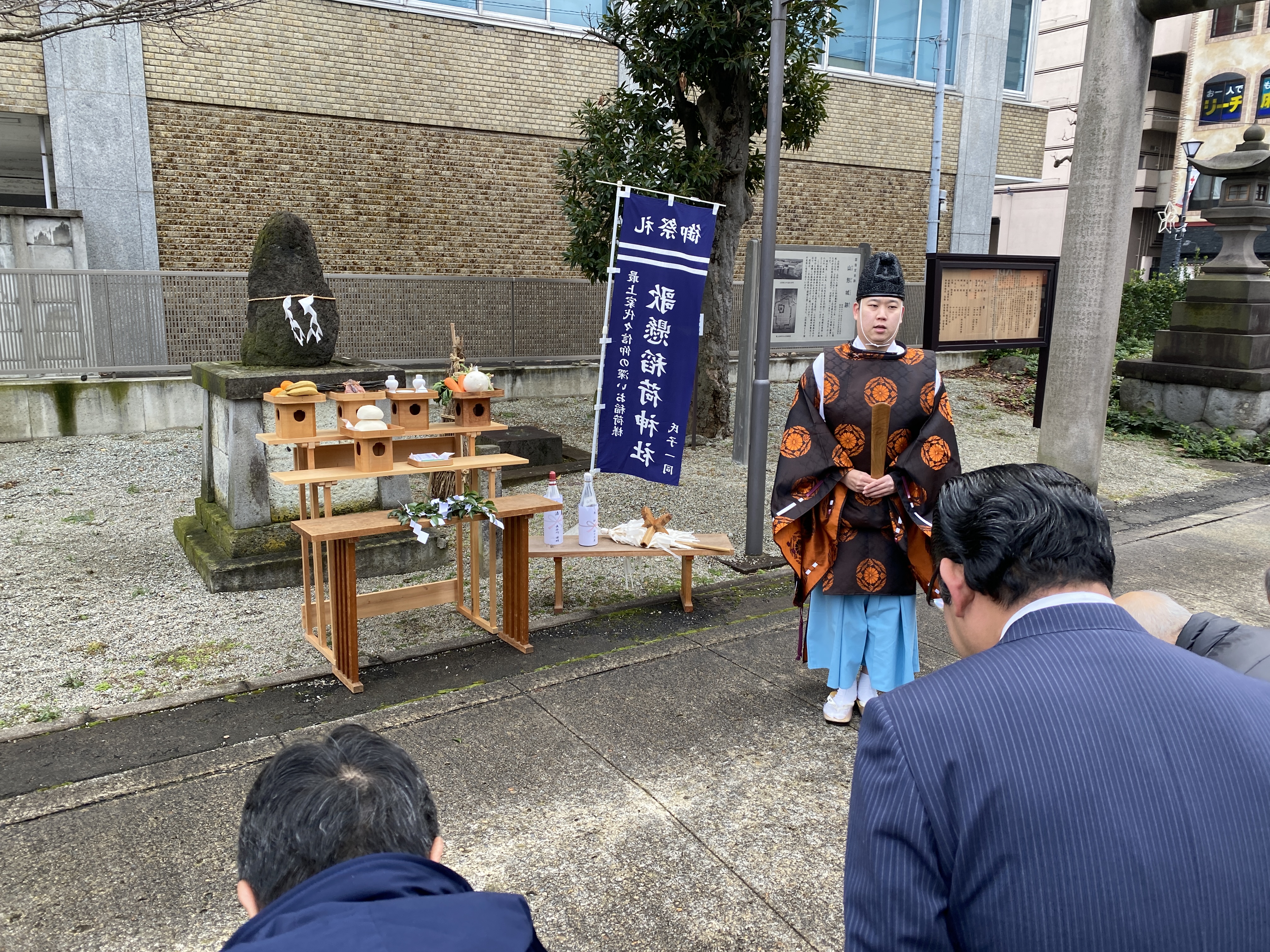 市神様のある歌懸稲荷神社、里の宮湯殿山神社でご祈祷。湯殿山神社では伝統の短冊切りカブ汁をご馳走になった。由緒ある初市と町の繁栄を代々十日町、旅篭町でそれぞれ祈り守ってきた両神社。山形の繁栄をこれからも祈ってもらいたい。