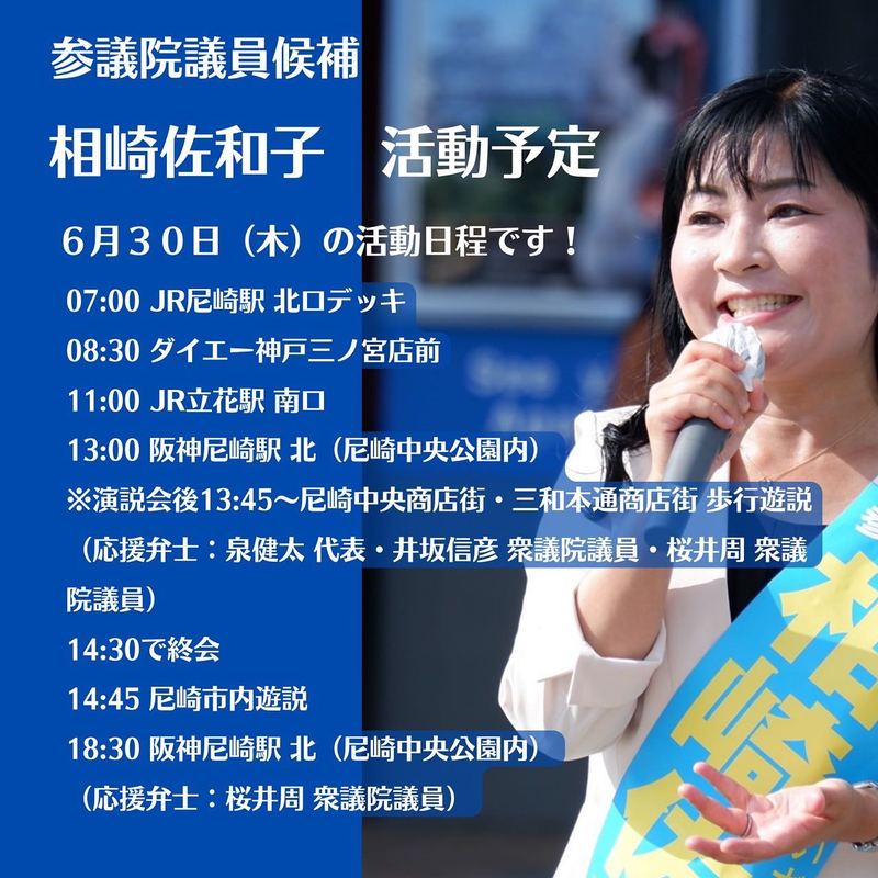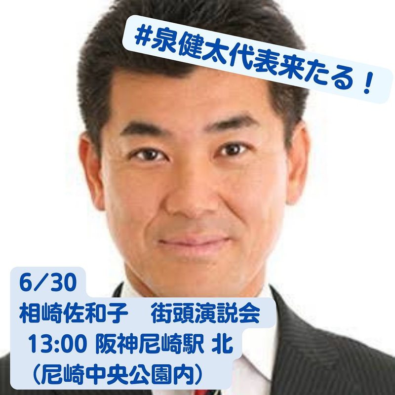 【泉健太】 本日13時〜13時50分、阪神尼崎駅に泉健太代表が相崎佐和子の応援に駆けつけます。 明日7月1日朝7時〜8時には、JR住吉駅にも泉健太代表が参ります。 どちらもお近くの方は、ぜひお立ち寄り下さい。 #参議院選挙 #兵庫県 #立憲民主党 #相崎佐和子 #尼崎市 #住吉