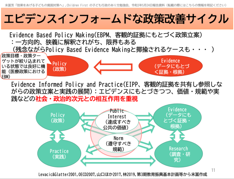 まず、末冨先生からは「EIPP(Evidence Informed Policy and Practice)」とデータサイエンティストの増員について提言がありました。EIPPとは客観的な証拠を共有しながら政策を実行し改善するサイクルのことです。従来の「EBPM(Evidence Based Policy Making、エビデンスに基づく政策立案)」よりも、政策のゴールを共有した研究者やデータアナリスト、政策立案者、実行機関が相互に連携し合い政策改善サイクルを回す点が優っている(下図)との説明がありました。