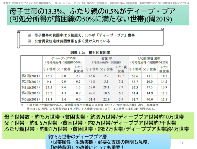 現状4者の連携がうまく取れておらず、エビデンスやデータが政策に反映されていなかったり、実行段階で課題が生じることが多々あります。例えば、貧困にあるひとり親世帯とふたり親世帯の支援の差がその1つです。労働政策研究・研修機構の研究によると、子どもの貧困はひとり親世帯にだけでなく、ふたり親世帯においても同様に存在します。(ディーププアに属するふたり親世帯は約4万世帯)