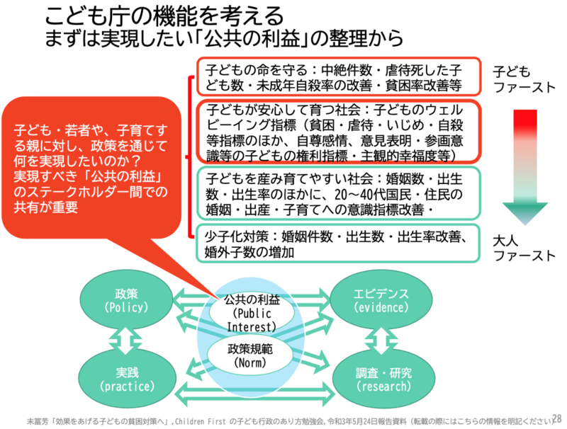 末冨先生の提言を踏まえ、「Children First」の政策が実行され、政策改善サイクルをしっかりと回す体制をこども庁でも確立できるよう、関係各所と連携しながら進めて参りたいと思います。