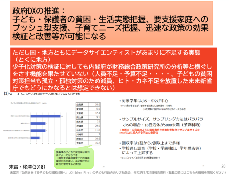 しかし、コロナ禍での児童扶養手当の上乗せはひとり親世帯の方が1ヶ月はやく支給されました。また、貧困レベルが同じにも関わらず、ひとり親とふたり親とで支援を受けられる所得額が異なるなど支援に差があるのです。このように、データを示すだけでは不十分で、データを政策立案に活かし実行したうえで評価する一連の流れが重要です。