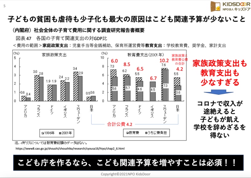 内閣府の社会全体の子育て費用に関する調査研究報告書によると、子育て関連支出(家族政策支出+教育費支出)の対G D P比が日本は先進国の中で最下位となっています。家族政策支出と教育費支出をそれぞれ他国と比較したとしても(下図参照)、子ども政策に使われている予算が非常に少ないことがわかります。