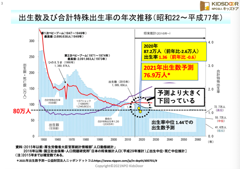 コロナ禍に見舞われた2020年の出生数は87.2万人(前年比-2.6万人)、出生率は1.36(前年比-0.6)と減少したことがわかりました。また、今年2021年には80万人をきる76.9万人という出生数予測が出ており、出生数が大きく落ち込む見通しであります。この原因は、コロナ禍で結婚する人が減ったことや、これからの人生の先行きが不透明な中で子どもをつくる人が減ったからだと言われています。
