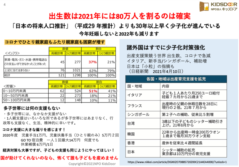 このようにコロナ禍で出生数が減ることは日本だけでなく、諸外国にも共通して見られる現象であり、各国では少子化対策強化のために様々な出産支援策を打ち出しています。例えば、シンガポールでは第2子への補助を従来の5割増しまで引き上げたり、イタリアでは子ども1人あたり月250ユーロ(日本円で約3万円)給付するなど少子化対策を強化しています。一方、日本では派遣型のベビーシッターサービスの利用補助を拡充し、妊娠中の女性に有給休暇をとらせた企業に助成するなどの施策を打っていますが、他国と比較すると十分な対策をしているとはお世辞にも言えない状況だ、との厳しい指摘もありました。