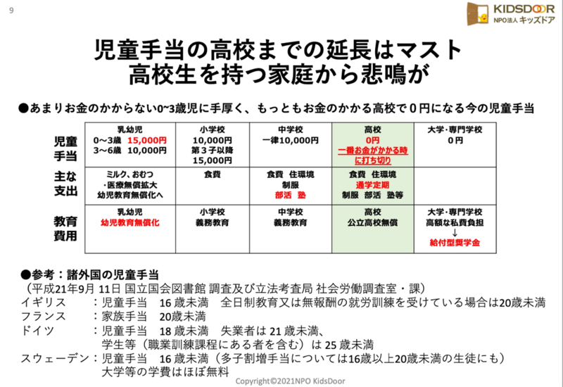 現在の日本の児童手当は、0歳から中学校卒業時まで支給されますが、高校生以降の児童手当はありません。しかし昔と異なり、今ではほとんど全ての子どもが高校に進学しています。実際、文部科学省によると現在の高校進学率は97%を超えています。加えて、高校生は中学生や幼児の時よりもお金がかかります。2万円の大学共通テスト検定料が高すぎて支払えず、受験を諦めてしまう貧困家庭が多く存在するのです。このように、お金のかからない0〜3歳児に手厚く、最もお金のかかる高校で児童手当が打ち切られるのは実態と合っていない、との指摘がありました。