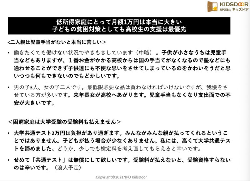 以上の観点から、日本の子ども関連支出は非常に少ないゆえに、子どもにその皺寄せがきてます。困窮家庭において「今」がとても大切です。「今、生きていけないと、1ヶ月生きていない。今を生きていける支援、それは、現金の支援です。 先々ではなく、今、助けて欲しい 」という声が保護者から寄せられおり、子ども支援の財源確保は急務だと力強い提言がありました。