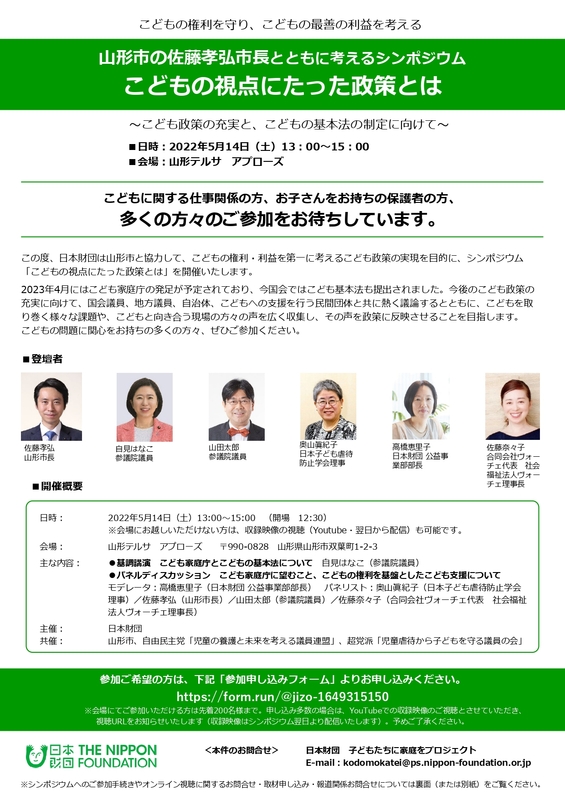 5/14(土)13:00~ 山形 テルサアプローズにて「佐藤孝弘市長とともに考える、こども政策シンポジウム」を開催!私はパネルディスカッションで参加します。