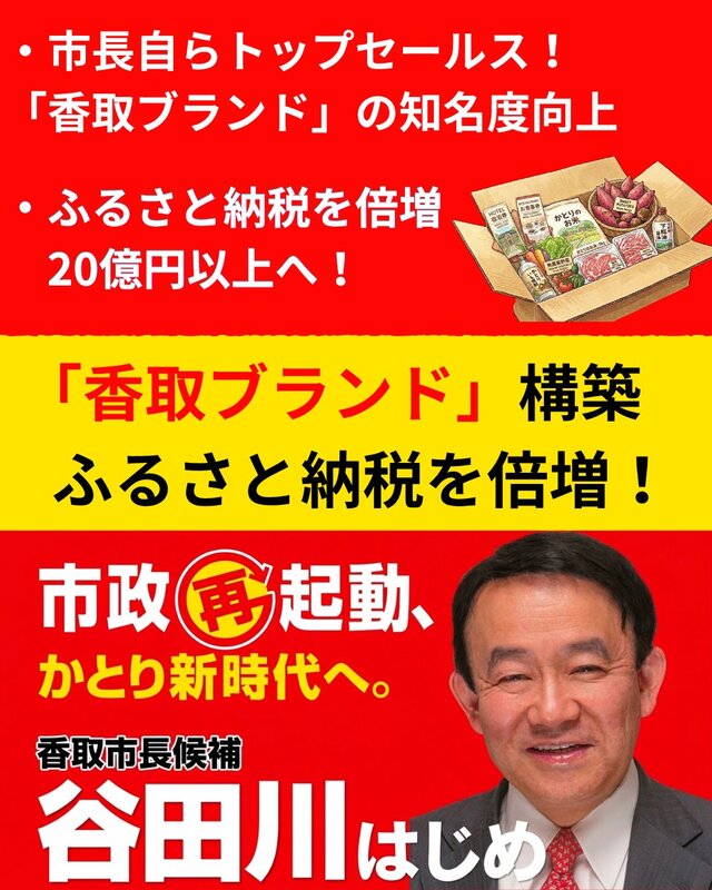 私は、市長自らが「トップセールスマン」となり、ふるさと納税を現在の倍以上、20億円以上へと引き上げることに挑戦します。