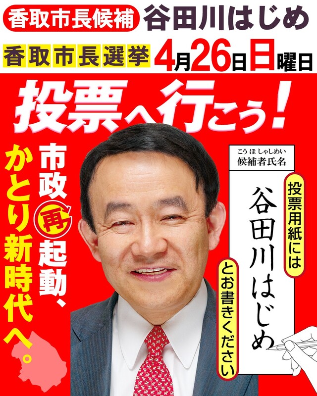 ホーム>政党・政治家>谷田川 元 (ヤタガワ ハジメ)>【明日は香取市長選挙投票日】あなたのその一票が、香取を動かす大きな力になります!投票用紙にはぜ...