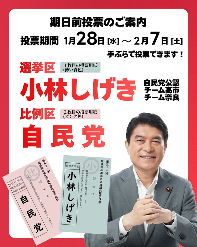 ホーム>政党・政治家>小林 しげき (コバヤシ シゲキ)>【奈良市・生駒市】期日前投票のご案内🗳️✨手ぶらでOK!2月8日(日)の投票当日にご予定がある...