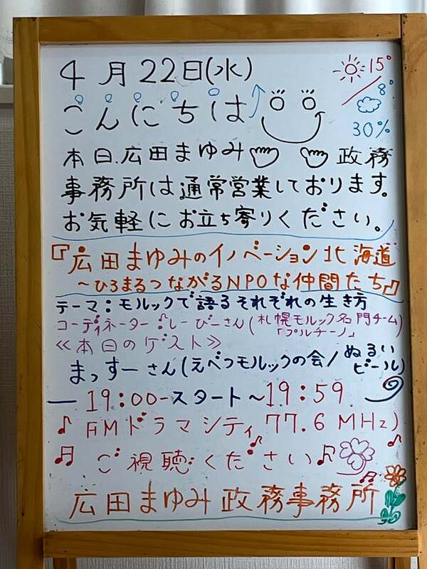 この後19時から生放送です。 厚別区の方は、77.6MHz