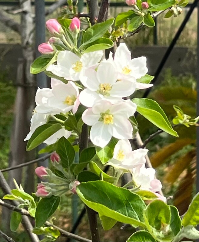 🍎彦根りんごの花、蕾はピンク色、花びらはほんのり桜色。