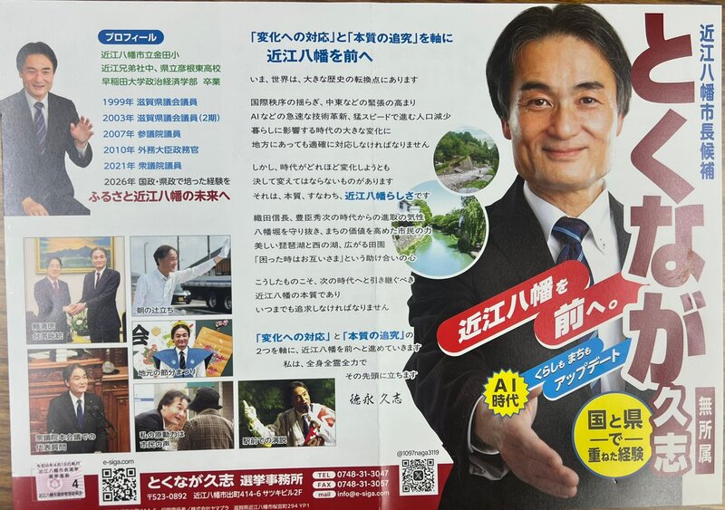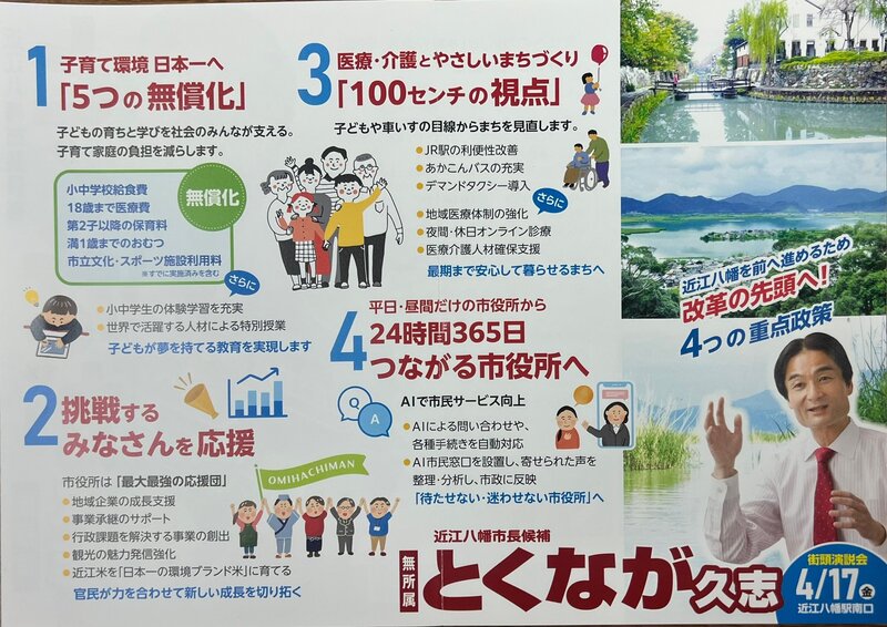 近江八幡の皆さんに感謝を込めて恩返し、県政や国政での経験を活かして、大好きな近江八幡のために、皆さんの幸せな暮らしを目指して、がんばっておられます。