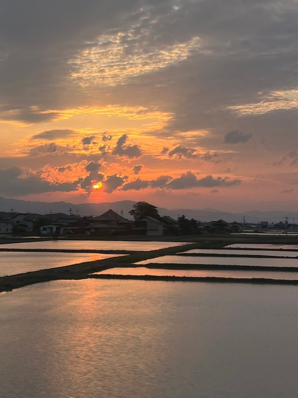 車窓の風景、田んぼの水鏡に夕日が綺麗です。」