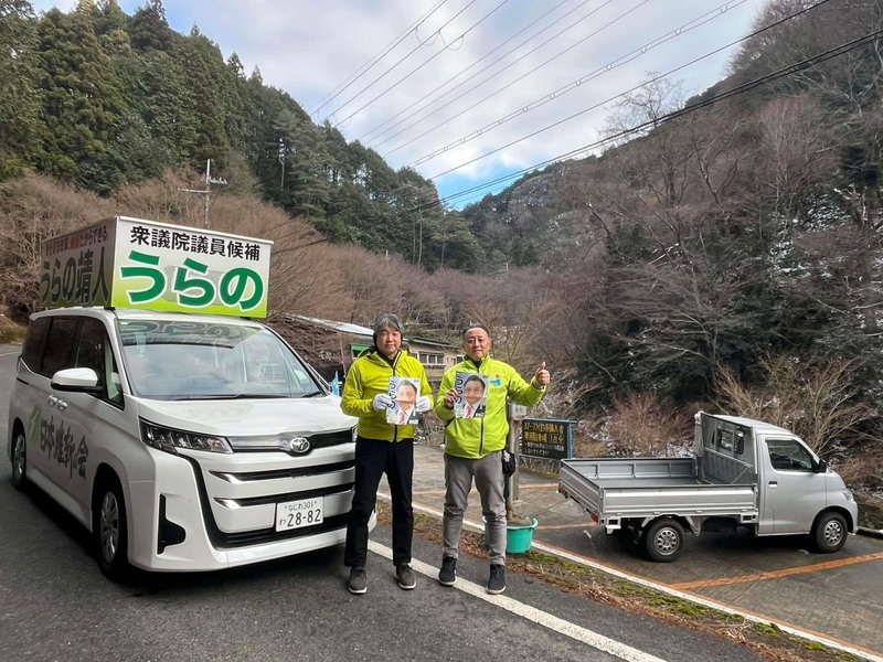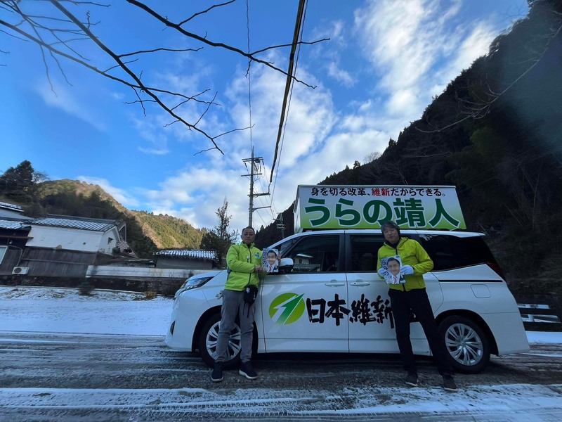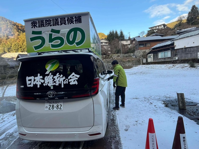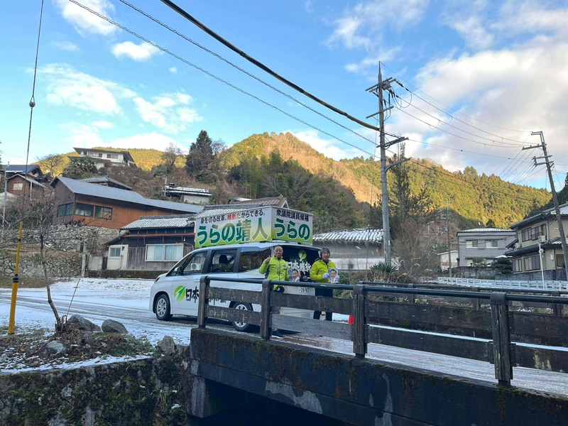 浦野号は、鈴木憲大阪府議会議員と田中祐二太子町長を乗せて、雪の残る太子町から千早赤阪村へと浦野へのご支持をお願いして走ります。