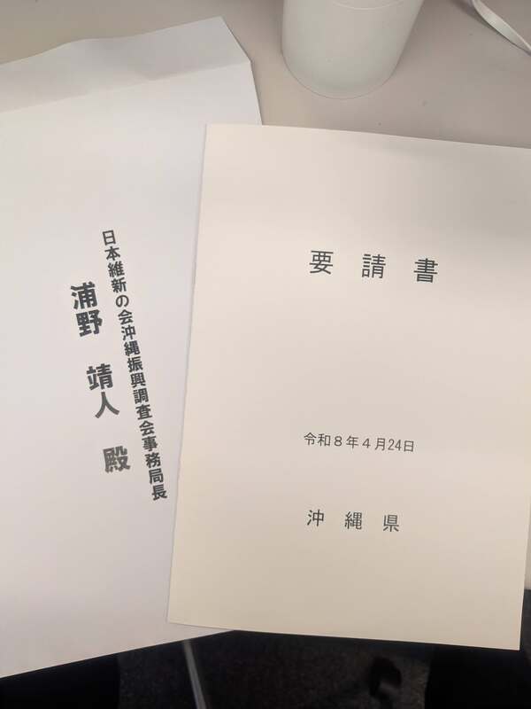 沖縄県の玉城デニー知事が、日本維新の会沖縄振興調査会に対して要望活動を行いました。 馬場伸幸調査会長と浦野靖人調査会事務局長(おきなわ維新の会代表)が対応し、沖縄振興のために全力で問題解決に務めることを約束いたしました。 (スタッフ投稿)