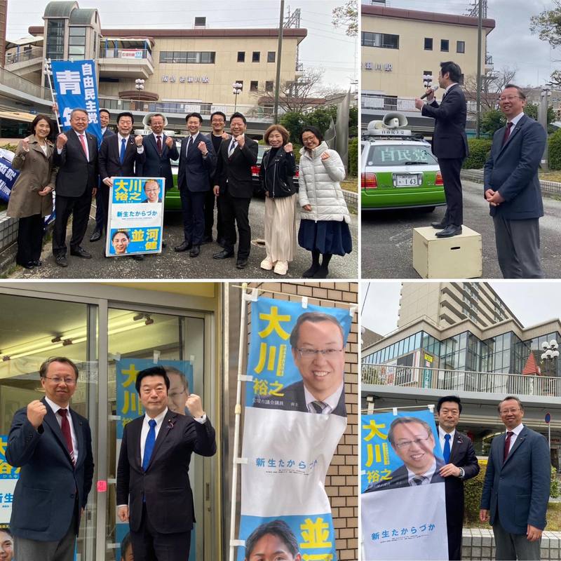 宝塚市にて #大川裕之 市長選挙立候補予定者(4月6告示、13日投票)の事務所を訪問‼️そして阪急逆瀬川駅前で街頭演説を行いました🎤✨ご当地の風早ひさお県議、冨川晃太郎議長はじめ、たからづか真政会の浅谷亜紀市議、大島千都世市議、桑原健三郎市議、持田ちえ市議、岩岡良介芦屋市議会副議長、吉田健吾神戸市議も駆けつけました‼️ #大川ひろゆき さんとは、同じ「#裕之同士」で、インフラ整備や観光振興、地方創生などを熱く語り合っていました。「#W裕之」で力合わせて頑張ります(^O^)q✨🇯🇵